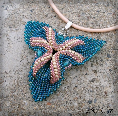 šítý šperk z rokajlu Preciosa a Toho v tmavomodré a žluté barvě
