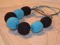 Náhrdelník z velkých dřevěných obháčkovaných korálků. Korále jsou od sebe odděleny uzlíky. Vše navlečeno na černé bavlněné šňůrce a točené šňůrce v tyrkysové barvě jakou jsou obháčkované korále. Komponenty ve stříbrné barvě.