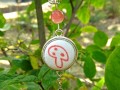 Náhrdelník je vytvořen z látkového buttonku s motivem červnooranžové houbičky, skleněné korálky a přívěsku peříčka ve stříbené barvě. Vše je zavěšeno na stříbrném řetízku zakončeném zapínáním karabinkou. Maximální délka řetízku je 53 cm.
