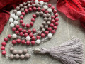 Dlouhé korále - mála ze 108 korálků - dřevěných, korálků bílého jadeitu velikosti 8 mm a křišťálových korálků 6 mm, proložených stříbrnými malými korálkami na šedé bavlněné šňůrce. Délka 50 cm (x2) + střapec s korálkem buddhy 9 cm.