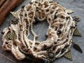 Háčkovaný náhrdelník z přírodní krémové příze s vháčkovanými korálky a mosaznými přívěsky. Zakončení kaplíky a OT zapínání v barvě mosazi.