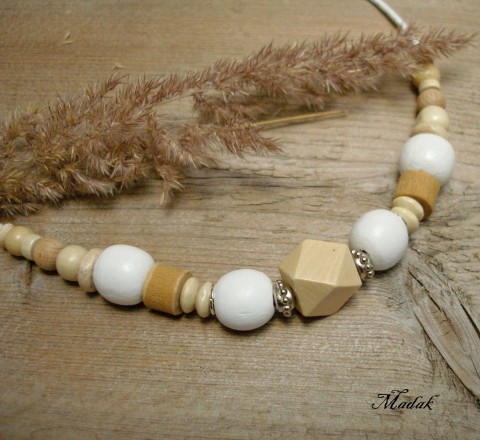 Originální přírodní náhrdelník z dřevěných korálků v barvách bílé a sv. natur, doplněno stříbrnými kaplíky a kroužky. Navlečeno na krémové bavlněné šňůrce.