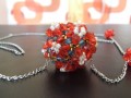 Náhrdelník na postříbřeném řetízku, hlavní motiv je kulicka slozená ze sklenených, plastových a pozlacených korálků. Průměr ,,květu" je cca 2 cm, tento květ je doplňen 4 menšími poupaty z plastových karmínově barevných korálků.