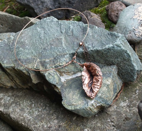 Náhrdelník je vytvořen pokovením listu, který je umístěn na měděný kruh s malým řetízkem - jeho délka je možná jednoduše nastavit - odšroubováním kuličky a nastavením délky řetízku. Vše je patinováno, broušeno a povrchově ošetřeno.