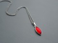Elegantní zašpičatělý přívěsek s červeným skleněným kamínkem je umístěný na řetízku z nerezové oceli.