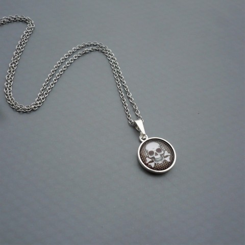 Rozverný kulatý přívěsek se skleněným kamínkem s motivem lebky je umístěný na řetízku z nerezové oceli.