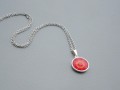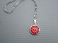 Elegantní kulatý přívěsek s červeným skleněným kamínkem s motivem květu je umístěný na řetízku z nerezové oceli.