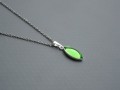 Elegantní zašpičatělý přívěsek se zeleným skleněným kamínkem je umístěný na řetízku z nerezové oceli.
