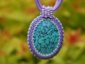 Skleněný kabošon 4x3 cm obšitý rokajlem, zavěšený na trojité šňůrce z umělého hedvábí 50 cm, se zapínáním vzadu.