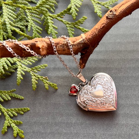 Otevírací zdobený medailonek ve tvaru srdce o průměru cca 2,7 cm je dozdoben malým srdíčkem s červeným zirkonem. Řetízek má délku 44 cm a na zapínání karabinku.