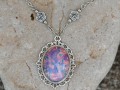 Opalizující skleněný kabošon 2,5x1,8 cm překrásných barev ve starostříbrném lůžku 3,5 x2,8 cm, doplněný kovovými korálky, celková délka řetízku 50 cm se zavíráním vzadu na karabinku.