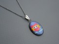 Oválný přívěsek se skleněným kamínkem s motivem barevné sovičky na modrém podkladu je umístěný na řetízku z nerezové oceli.