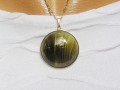 Přívěsek s krásným skleněným kabošonem vlepeným do kovového lůžka.