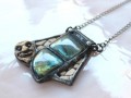 Náhrdelník starobylého vzhledu je vyroben z dvou krásných kousků labradoritu s nádhernými barevnými odlesky, ze tří mnou modelovaných keramických střepů, z mědi a cínu technikou cínování - tiffany. Celý přívěsek má rozměr 5,4 x 5cm a je zavěšen na 43cm dlouhém šedočerném řetízku s karabinkou. Oba kameny mají drobné přírodní prasklinky - nejedná se o poškození nebo vadu kamene. Mimo řetízku a karabinky je vše ruční práce a jedná se o autorský šperk. Patinováno, ošetřeno antioxidantem.