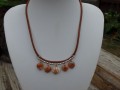 Středový díl je 7 cm široký a je zavěšený na kulaté kůži dlouhé 45 cm. Náhrdelník je zakončený ručně drátovanými koncovkami a karabinkou z obecného bižuterního kovu.