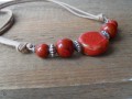 Jednoduchý náhrdelník s keramickými a kovovými korálky na hrubé bavlněné šňůře.