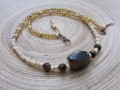 Náhrdelník z dřevěných, nepravidelných, přírodních rondelek, ze světle medových skleněných korálků, v hnědých tónech korálků a broušeného obdélníčku polodrahokamu tygřího oka. Navlečeno na barvené, hnědé, lněné šňůrce, která je zakončena na kroužek s karabinkou z nerezové ocele.