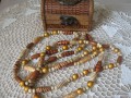 Dvouřadý náhrdelník je vyroben z dřevěných a kovových korálků. Je lehký.