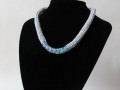 Je vytvořen technikou ručního pletení na cívce z bavlněné světle šedé příze v kombinaci s perleťovou efektní přízí. Dozdoben vpletenými blankytně modrými korálky. Bezešvá dutinka je měkká a ohebná, ale přitom pěkně drží oblý tvar kolem krku, lehce se přízpůsobí vašemu tělu, je mírně pružná. Efektní příze je ze tří čvrtin z viskózy a je pletená, nikoli skaná (kroucená) jako většina "kovových" přízí, a tak z ní "nečouhají" metalická vlákna. Proto je podajná a měkká, příjemná kombinace s bavlnou.