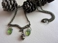 Náhrdelník je vytvořen ve stylu vintage z bižuterních, kovových komponentů v úpravě starobronz a ze skleněných, zelených lístečků.