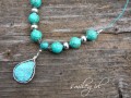 Náhrdelník na ocelovém lankou v bleděmodré barvě s kuličkami tyrkenitu a kovovými korálky. Dominantou je odrátovaný přívěsek tyrkenitové kapky.