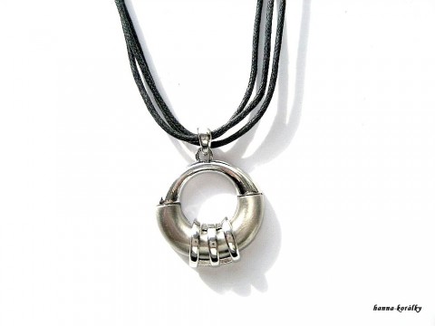 Náhrdelník s kovovým příveskem kolečko - 2,8x3cm ve stříbrné - platinové barvě v kombinaci lesklého a matného kovu na černé třířadé šňůře 40cm + 8cm prodlužovací řetízek.