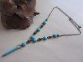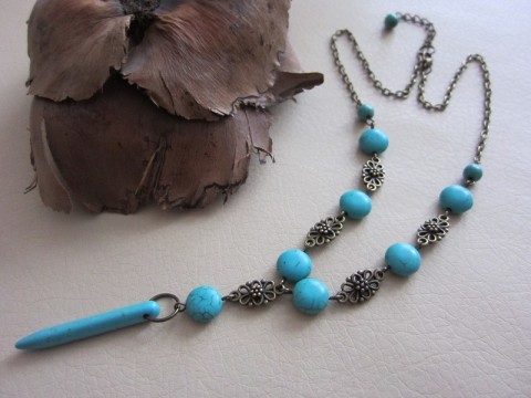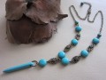 Náhrdelník je vytvořen z komponentů z obecného bižuterního kovu v úpravě starobronz a z placek a korálků tyrkysové modrého howlitu, bodlina je z rekonstruovaného tyrkysu.