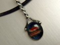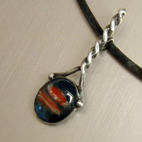 Náhrdelník s přívěskem s originálním skleněným kabošonem z italského skla millefiori, vyrobeným ve vlastní dílně a zasazeným do cínu. Přívěsek je velký 5 x 2 cm a je zavěšený na kulatém koženém řemínku, dlouhém 46 cm - lze upravit. Je patinovaný, leštěný a ošetřený antioxidantem.