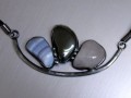 Cínovaný náhrdelník se třemi tromlovanými valounky minerálů - bleděmodrého chalcedonu, hematitu a růženínu. Cínovaná partie je velký 7 x 3 cm a je upevněná na splétaném koženém řemínku, dlouhém 43 cm - lze upravit. Má prodlužovací řetízek.