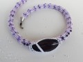 Lehký textilní náhrdelník třeba pro "malou večerní". Je zdobený tmavě fialovým keramickým kabošonem (kerašonem) s lesklou glazurou. Do krajky zasazený kerašon je pevnou součástí ručně pletené dutinky z fialové melírované bavlněné příze v kombinaci s perleťovou bílou efektní přízí s jemným leskem, dozdobené filovými korálky. Bezešvá dutinka je měkká a ohebná, ale přitom pěkně drží oblý tvar kolem krku, lehce se přízpůsobí vašemu tělu, je mírně pružná. Efektní příze je ze tří čvrtin z viskózy a je pletená, nikoli skaná (kroucená) jako většina "kovových" přízí, a tak z ní "nečouhají" metalická vlákna. Proto je podajná a měkká, příjemná kombinace s bavlnou.