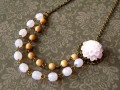 Romatický náhrdelník s levandulovou resinovou chryzantémkou, doplněný ohňovkami ve stejné barvě a tělovými perličkami. Ty tvoří řetízky ve dvou řadách. Zakončeno karabinkou, komponenty staromosazné.