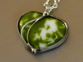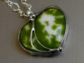 Náhrdelník se srdíčkem z bílozeleného skleněného kabošonu, vyrobeného spékáním skla ve vlastní dílně a vsazeného do cínu. Přívěsek je velký 2,5 x 2,5 cm. Je zavěšený na ozdobném řetízku, dlouhém 48 cm. Leštěno a ošetřeno antioxidantem.