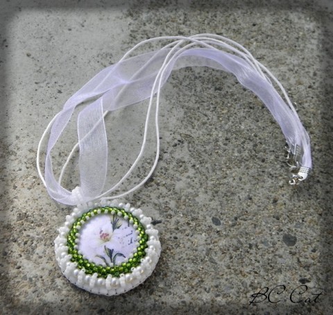 * náhrdelník - kabošon s motuvem lilie je obšitý zeleným a bílým rokajlem, doplněný smetanovými voskovými perličkami a podložený filcem