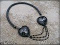 ústředním bodem jsou potom dvě skleněná srdce v kouřové barvě, obšitá týmž rokajlem a podložená semišem, dozdobená ketlovanými řetízky z černých ohňovek
