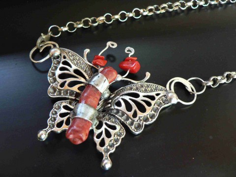 Cínovaný šperk s motivm secesního motýla dotvořen korály..