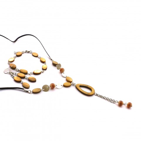 Dominantou náhrdelníku je středový motiv: Olivově zelenohnědá perleťová kapka, z jejíž spodní části vybíhají dva drobné řetízky různých délek, zakončené hnědým proužkovaným plastovým korálkem. V horní části nad kapkou jsou umístěny z každé strany hnědé proužkaté plastové korálky a malé olivově zelenohnědé perleťové oválky. Celá korálková část je zavěšena na hnědém koženém řemínku.