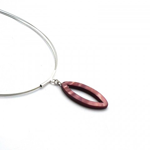 Perleťový vykrojený oválek v burgundy odstínu (růžovofialovočervená) je zavěšen na vlastnoručně vyrobené trojité strunce z bižuterního lanka stříbrné barvy (v případě zájmu mohu použít i černé lanko).
