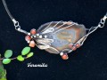 Šperk je vyroben cínováním. Je tvořen překrásným plochým nepravidelným 6 x 4 cm velkým achátem, který má přírodní béžovou barvu s tmavě hnědým okrajem. Střed kamene tvoří zbroušené krystaly, které vytvářejí zajímavou síťovou kresbu. Celkovou kompozici dotvářejí karneoly.