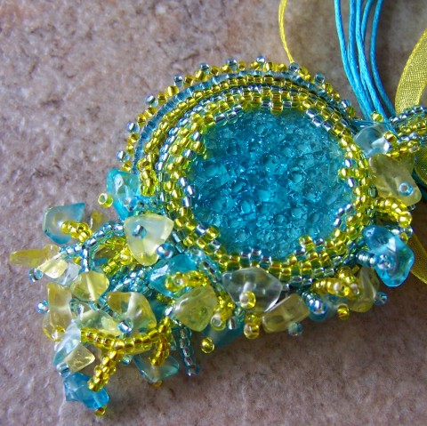 Autorský ručně šitý přívěsek je vyroben z krásného tyrkysového keramického kabošonu (o velikosti 30 mm), který je obšitý světle modrým rokajlem se stříbrným průtahem, modrým rokajlem se stříbrným průtahem a žlutým rokajlem se stříbrným průtahem. Dále je dozdoben skleněnými zlomky v modré a tmavě žluté barvě. Přívěsek je podšit šedým filcem a je zavěšen na šňůrce, která je tvořena ze třech tyrkysových bavlněných voskovaných šňůrek a z citronově žluté šifonové stuhy.