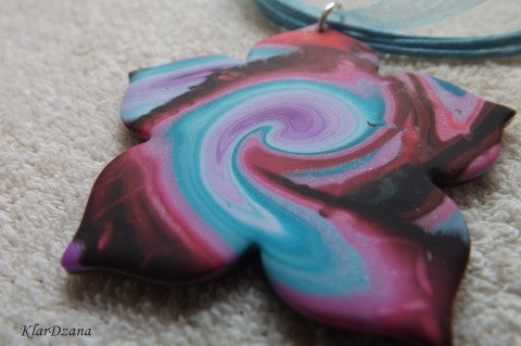 Přívěsek z polymeru na světlemodré organzové stužce s voskovanými šňůrkami