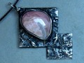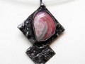 Náhrdelník se zajímavě vybarveným kabošonkem rodonitu, zasazeným do cínu. Přívěsek je velký 4,5 x 3 cm a je zavěšený na černé obruči, průměr 15 cm - lze vyměnit za kožený řemínek, nebo řetízek. Je patinovaný, leštěný a ošetřený antioxidantem.