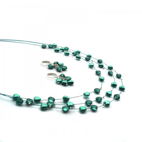 Náhrdelník je tvořený z tří řad pravidelně rozmístěných drobných skleněných, jemně povoskovaných srdíček zelené barvy, které jsou navlečeny na zeleném bižuterním lanku.