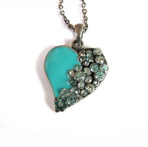 Krásné smaltované srdíčko zdobené kamínky v barvě tyrkysové.