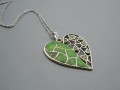 Větší ozdobné zelené kovové srdce je umístěno na řetízku z nerezové oceli.