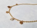 Jemný náhrdelník je vytvořen z drobného zlatého řetízku na kterém je zavěšen 5 drobných přívěsků - 3 zlaté kulaté plíšky, voskovaná perlička a přívěsek slona.