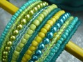 Náramek z paměťového drátu - 11 otoček, průměr 6 cm, šířka 4,5 cm. Tyrkysový, žlutý a zelený rokajl a voskované kuličky