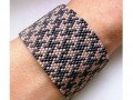 Náramek s jedinečným vzorem, ušitý z vysoce jakostního japonského rokajlu Miyuki delica v barvách tmavě modrá matná a lososová opalizující.