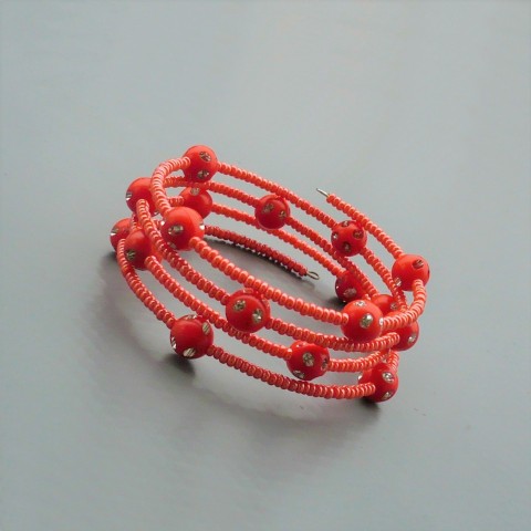 Oranžovočervené korálky jsou společně s většími kuličkami, které jsou stříbrně ozdobené, navlečeny na čtyřech řadách paměťového drátku (i přes velké roztažení se vrátí do svého původního tvaru).