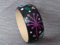 Dřevěný náramek s abstraktním květinovým motivem na černém podkladu. Ručně malovaný. Ošetřený dvěma vrstvami nezávadného laku pro dlouhou životnost.