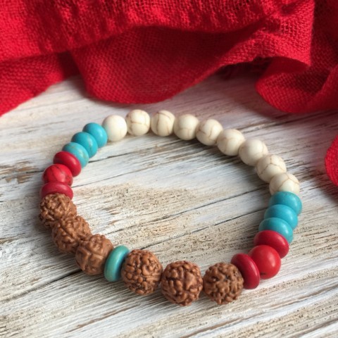 Náramek z kuliček krémového, červeného a tyrkysového howlitu (8 mm) a korálků Rudraksha. Náramek je pružný - cca 18 cm